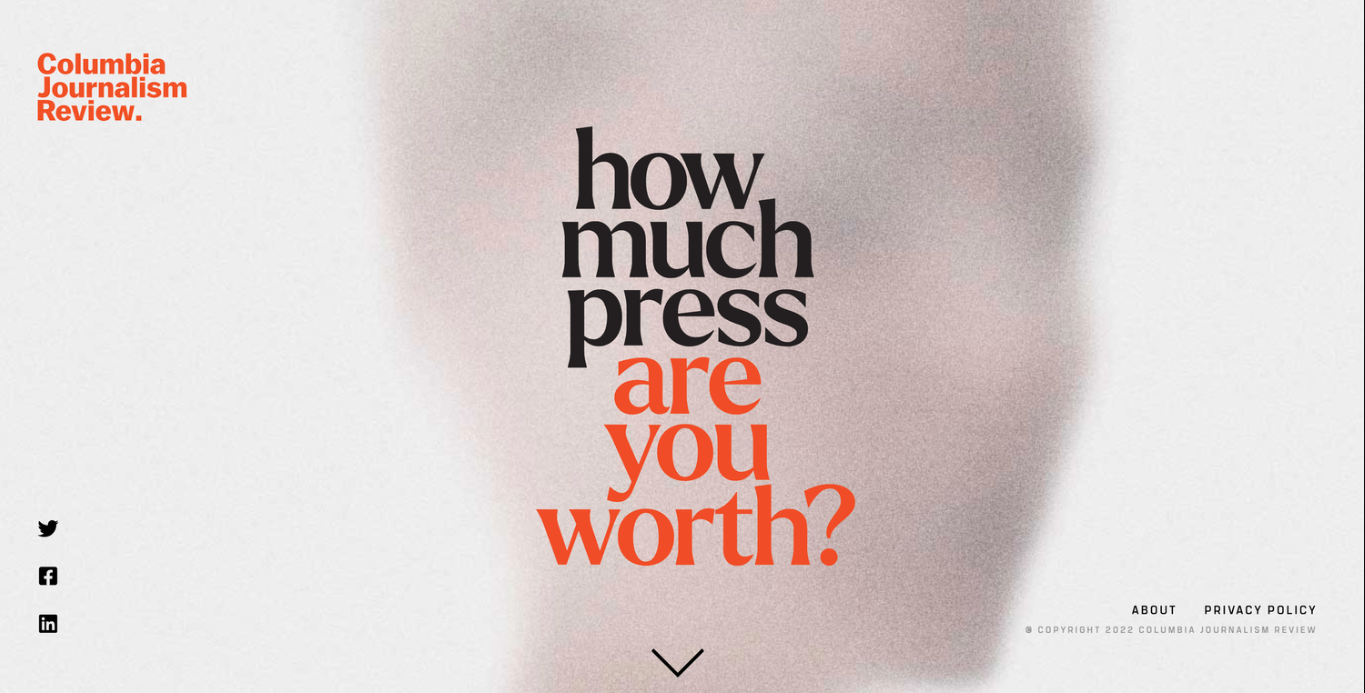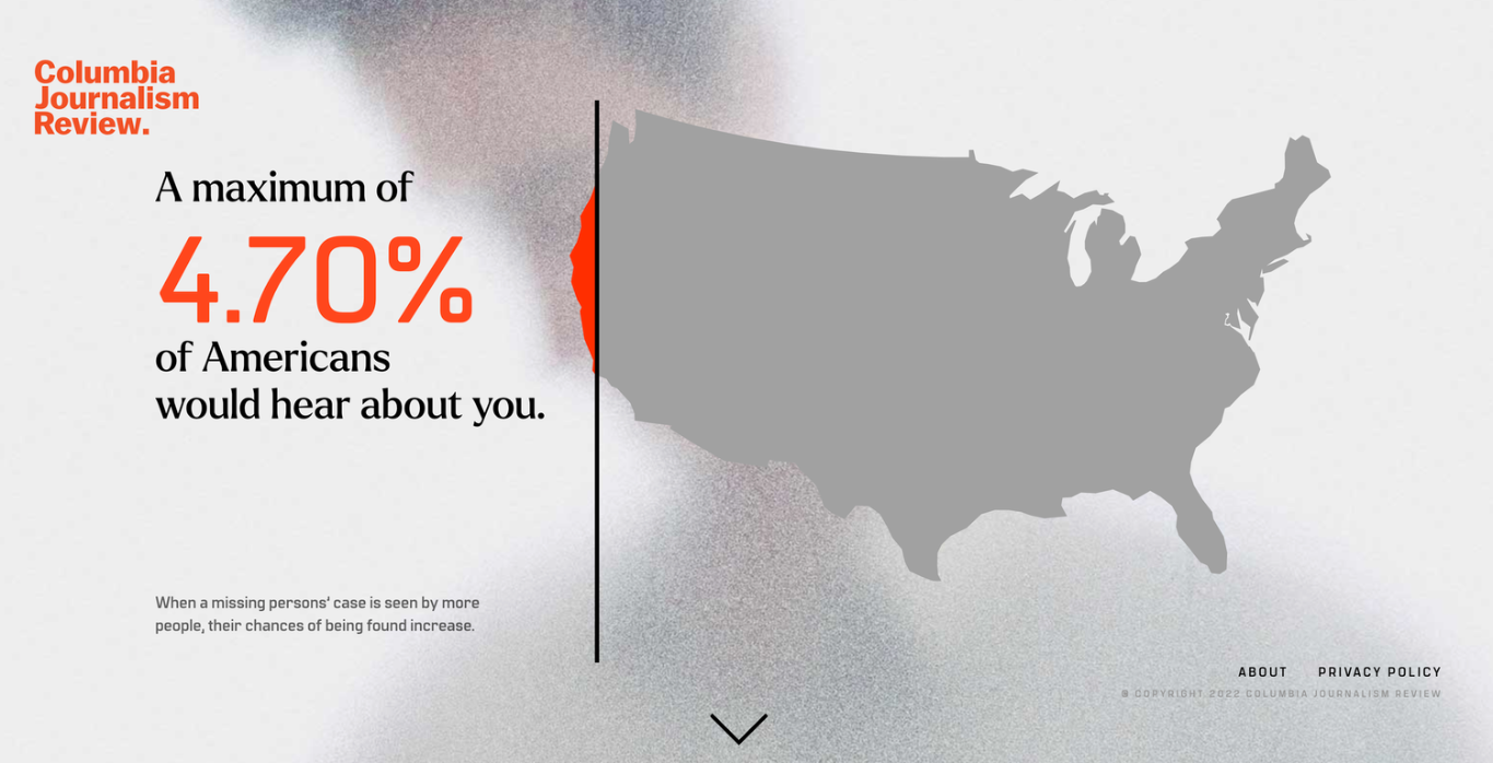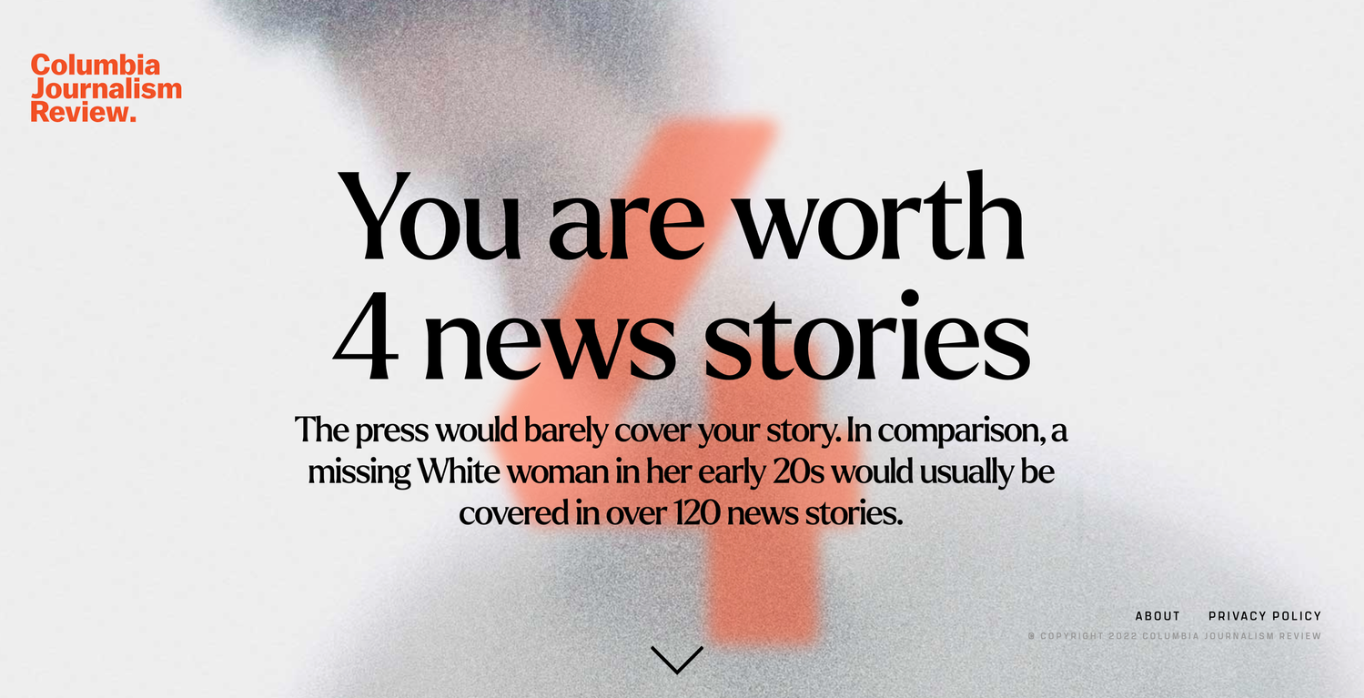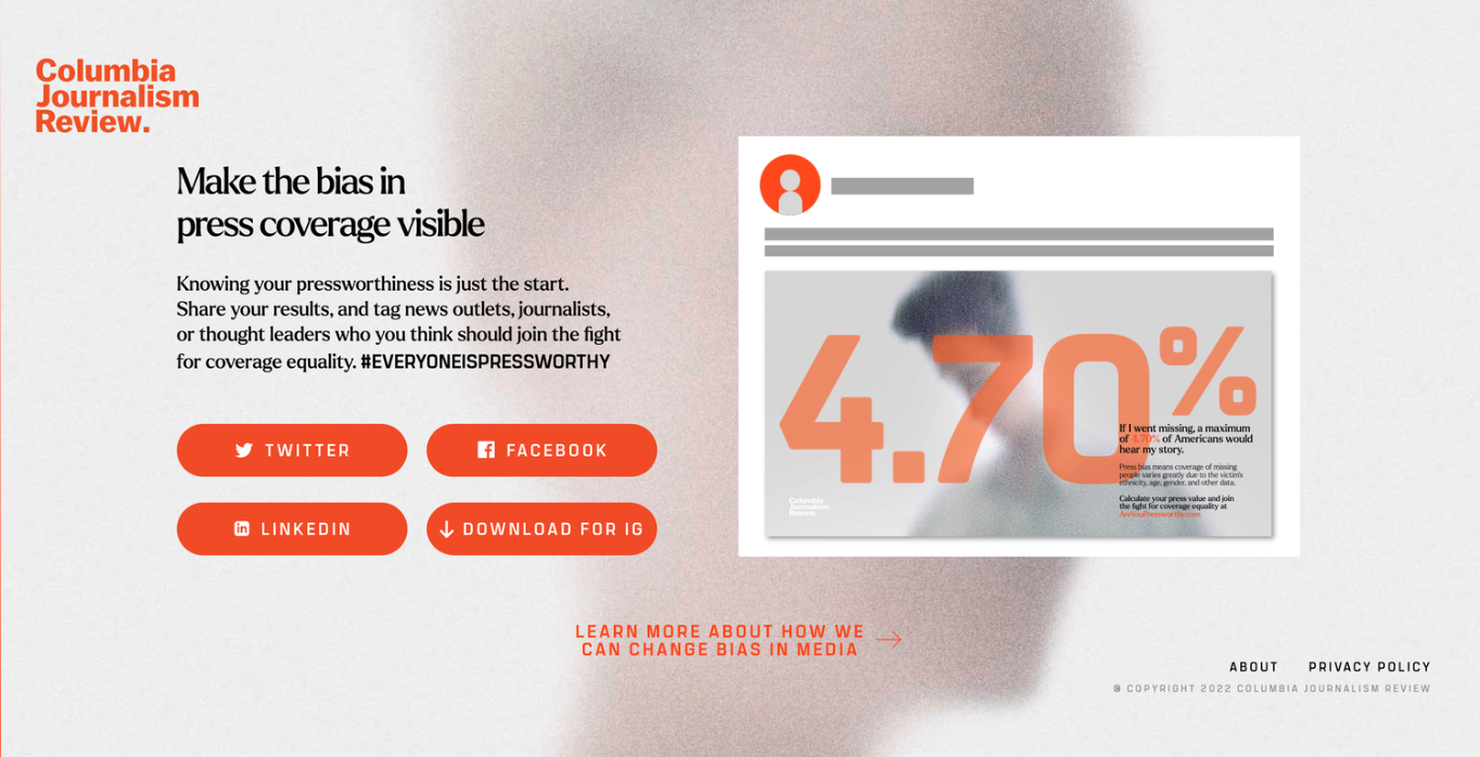 There’s a huge bias when it comes to reporting of missing people - a phenomenon often called “Missing White Woman Syndrome”. Reports are often determined by demographics such as ethnicity, gender, age and location. We worked with the Columbia Journalism Review to create AreYouPressworthy.com, an online tool that lets users enter their demographic data, and see how the press would cover their story if they went missing, giving them the information they need to join the fight for coverage equality.